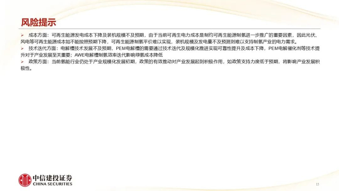 技术迭代方面:电解槽技术发展不及预期,PEM电解槽的需要通过技术迭代及规模化推进实现可靠性提升及成本下降,PEM电解催化剂等技术提升对于产业发展至关重要;AWE电解槽制氢效率迭代影响绿氢成本降低