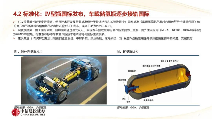 标准化:国家标准《车用压缩氢气塑料内胆碳纤维全缠绕气瓶》和《 高压氢气瓶塑料内胆和氢气相容性试验方法》发布,车载氢气瓶技术路线即将与国际主流接轨,Ⅳ型瓶应用突破政策限制。
