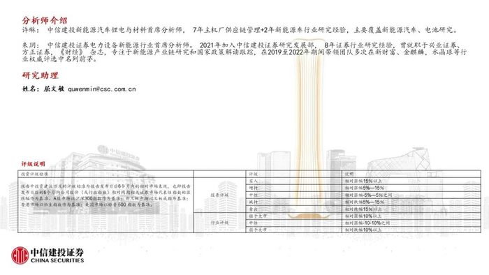 许琳:中信建投新能源汽车锂电与材料首席分析师, 7年主机厂供应链管理+2年新能源车行业研究经验,主要覆盖新能源汽车、电池研究。