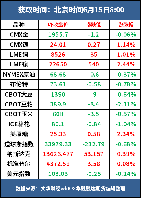 6月14日国内不锈钢现货具体报价如下:天管、酒钢304/2B冷轧主流切边报价15350-15600元/吨,张浦报15600-16300元/吨,民营钢厂宏旺、甬金毛边基价报15200-15400元/吨,报价较上一日无变化。对2307合约平均基差190(-180)。高镍铁主流成交价1090(-0)元/镍,出厂含税;高碳铬铁报价主流报8850(-0)元/50基吨(数据来源:Mysteel)。上期所注册仓单量33875吨(-595吨)。