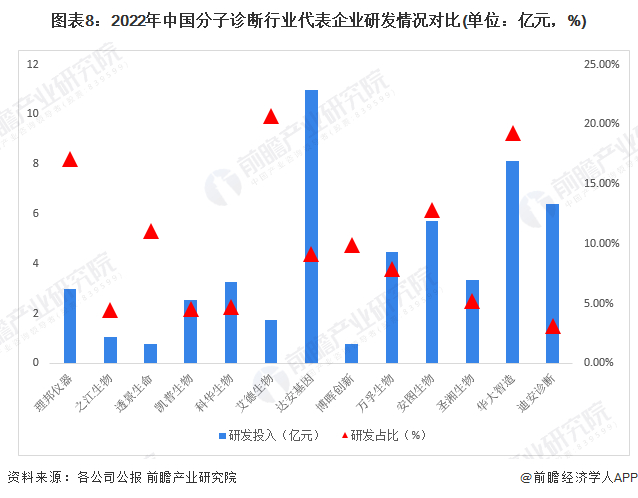 分子诊断行业技术研发实力要求较高,研究单位对分子诊断研发的持续投入,推动分子诊断专利技术持续更新。从分子诊断行业代表企业研发情况来看,达安基因和华大制造研发投入较大,均在8亿元以上,理邦仪器、艾德生物和华大智造研发力度较大,研发投入占营业比重均超过15%,具体情况如下: