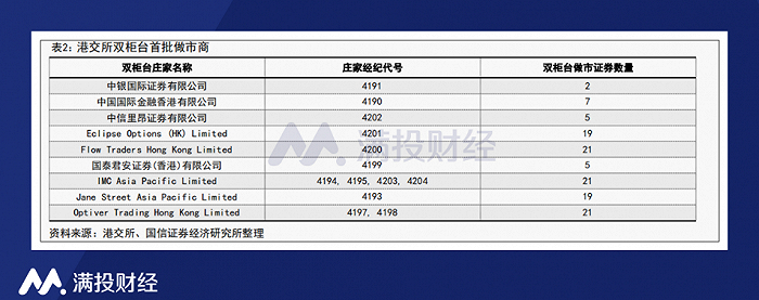 6月5日,港交所公布了首批的9家做市商,其中属于中资香港集团的券商上市标的有三只,分别为中银香港(02388.HK)、中信证券(06030.HK)、国泰君安(02611.HK)。