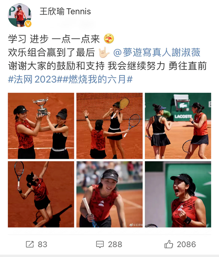 双打夺冠后,王欣瑜在微博上表示以后会“继续努力”。的确应该努力,她的“前辈”李娜就是很好的例子。