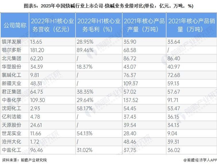 目前,我国烧碱产业链上游主要由中泰化学、滨化股份、鲁北化工等企业进行原材料供应。中游主要由上海烧碱化工股份有限公司、安徽华塑股份有限公司、江西世龙实业股份有限公司、浙江嘉化能源化工股份有限公司、宜宾天原集团股份有限公司、沈阳化工股份有限公司、浙江镇洋发展股份有限公司、内蒙古鄂尔多斯资源股份有限公司、内蒙古君正能源化工集团股份有限公司等公司进行细分产品供应。