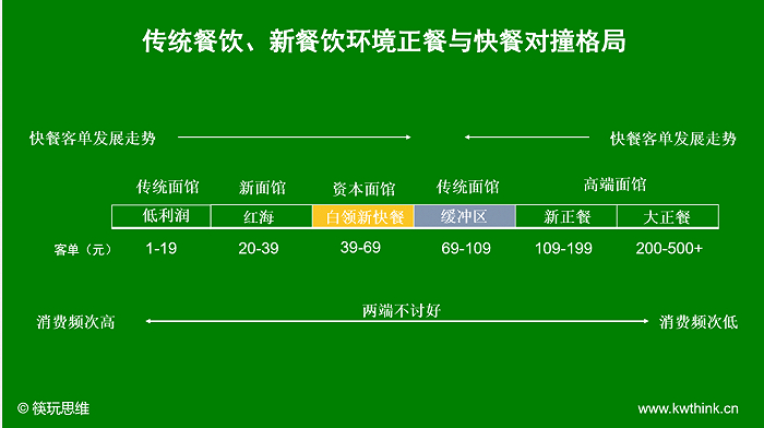 餐饮业可以分为两个大类:经常去的快餐、偶尔去的正餐。筷玩思维(www.kwthink.cn)还了解到餐饮业近些年来一个比较有意思的环境变化:快餐的价格越来越高,而正餐的价格越来越低。