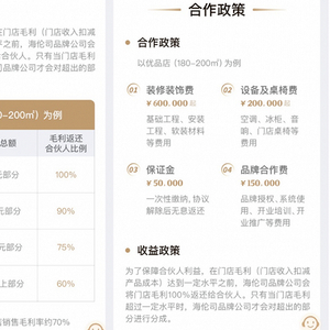 其中,以优品店为例,加盟合作费用包括600000元起的装修装饰费,200000元起的设备及桌椅费,50000元的保证金和150000元的品牌合作费。
