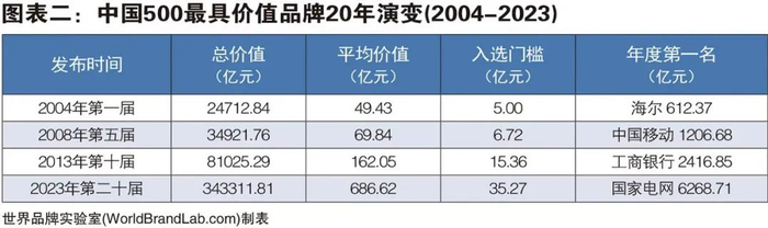 2023年《中国500最具价值品牌》的总价值为343311.81亿元,比去年增加33583.74亿元,增加幅度为10.84%。世界品牌实验室编制中国品牌报告已是第20个年头,2004年入选门槛仅为5亿元,前500名品牌的平均价值为49.43亿元。20年以后的2023年,入选门槛已经提高到35.27亿元,而前500名品牌的平均价值高达686.62亿元,增加幅度为1289.08%,本年度共有72个中国品牌的价值超过1000亿,比去年增加了3个,排名含金量十足。
