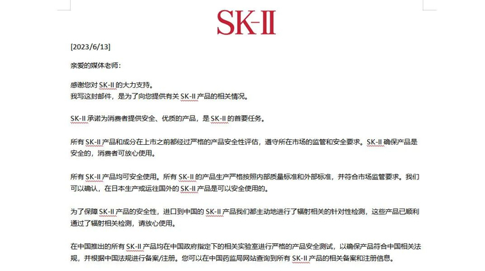 SK-II确保产品是安全的,消费者可以放心使用。”