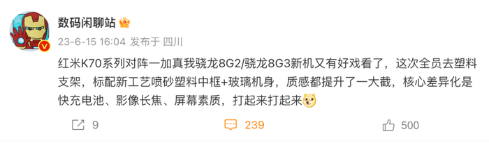 【前沿】质感大提升!Redmi K70曝全员取消屏幕塑料支架