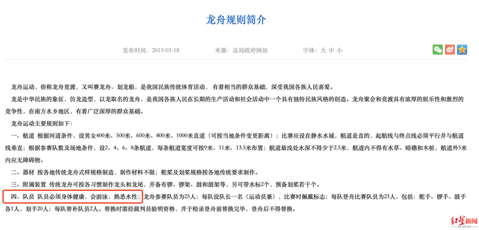 扒龙舟选手的选拔依据是什么?张伟潮向红星新闻解释:“主要是看选手的耐力、经验、体能和各项专业技能。”同时,红星新闻在国家体育总局官网看到,该局2013年3月发布的《龙舟规则简介》,也要求队员必须身体健康,会游泳,熟悉水性。