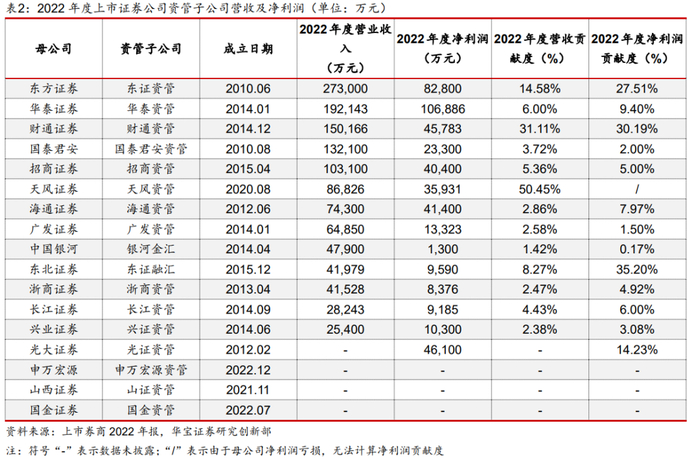在披露营收的13家资管子公司中,营业收入贡献率的中位数为4.43%,净利润贡献率(净利润贡献率=子公司净利润/母公司合并报表净利润)的中位数为5.5%,天风资管的营收贡献率最高,2022年度天风资管实现营收8.68亿元,营收贡献度超过50%;东证融汇净利润贡献度最高为35.20%。