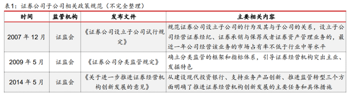 证券公司子公司的发展伴随着证券公司的分业经营、规范监管、综合治理,在一系列法规政策引导下,证券公司合理审慎扩张版图。2007年,证监会发布《证券公司设立子公司试行规定》,用来规范证券公司设立子公司行为,要求设立经纪子、投行子、资管子时业务市占率必须在中位数水平以上,给定了基本规范框架;随后在证券公司分类监管、创新发展意见等多个文件中,不断规范证券公司设立子公司要求,加强对境内外子公司监管体系,引导证券公司突出主业、发掘特色,不断向集团化、专业化、国际化发展。