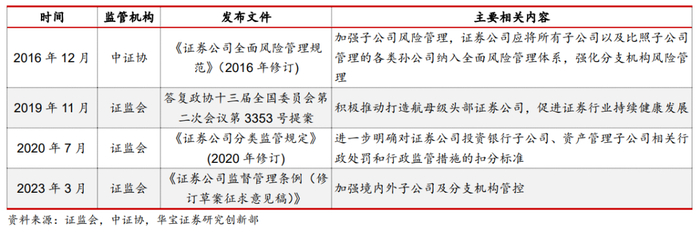 目前关于证券公司子公司管理规定的政策文件主要是以2007年《证券公司设立子公司试行规定》为主,并在2012年进行了修改。其实无论是从证监会2016年修订《证券公司风险控制指标管理办法》中要求“证券公司建立全面风险管理体系”,到2020年《证券公司分类监管规定》、2023年《证券公司监督管理条例(修订草案征求意见稿)》,文件中都反复强调加强境内外子公司风险管控,还有2020年首批6家券商纳入并表监管试点,监管都在加强以合规为准绳,通过自下而上的试点方式,参照海外集团化管理经验,针对子公司风险制度、风险评估、流动性管理、人才培养和流转机制等问题进行先试先行,期待试点机构集团化进展更为成熟后,发展更适应中国市场发展的证券公司子公司管理模式。