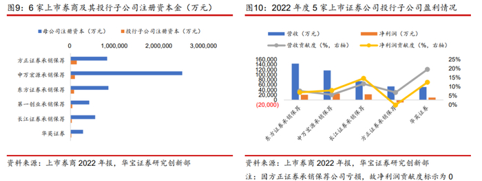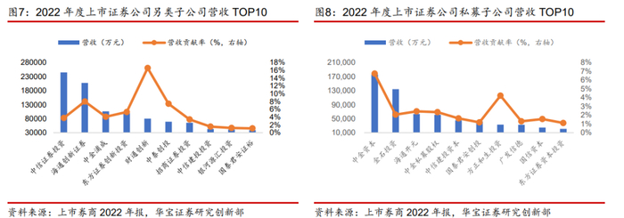 第一,受市场波动和投资环境影响较大,整体营收贡献度较低,在披露2022年度营收的41家全资私募子公司中,营业收入贡献率的中位数仅为0.77%,40家另类子营收贡献率中位数仅为0.63%,多家上市券商存在投资子公司亏损情况,投资类子公司盈利较为薄弱。