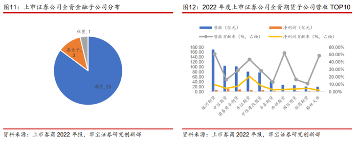 截至2022年末,上市券商共拥有27家全资控股金融业务子公司,其中期货子公司23家,占据主要部分;基金子公司3家,租赁子公司1家。如前所述,证券公司设立或购买期货子公司具有历史发展的先天条件,受益于较早成立进入市场,券商系期货公司占领了期货市场的主要份额,也是多家头部券商重要营收来源。