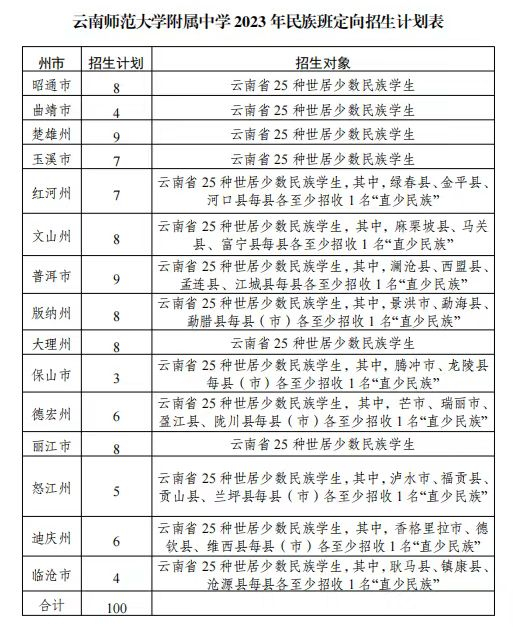 根据《云南省教育厅 云南省民族宗教事务委员会关于做好2023年云南师范大学附属中学、云南民族中学、云南民族大学附属高级中学云南省民族团结进步示范高中班招生工作的通知》,2023年云南师大附中面向全省招收25种少数民族应届初中毕业生100名。(各州市招生计划看下表)