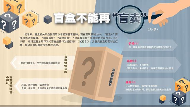 盲盒走红于市场且受到大批消费者追捧之际,经营过程中产生的信息不透明、售后不到位等问题也备受诟病。6月15日,国家市场监管总局印发《盲盒经营行为规范指引(试行)》(以下简称《指引》),为野蛮成长的盲盒市场带来新的“游戏规则”。《指引》指出,完善未成年人保护机制,对盲盒销售对象的年龄作严格限制,要求不得向未满8周岁未成年人销售,同时,要求盲盒经营者将盲盒内物品的商品价值、抽取规则、抽取概率等关键信息以显著方式对外公示,引导理性消费。分析指出,《指引》的出台将进一步规范盲盒市场,也将为企业提供可参考的准绳,促使从业者从定价、销售、设计等诸多方面权衡盲盒的利弊。