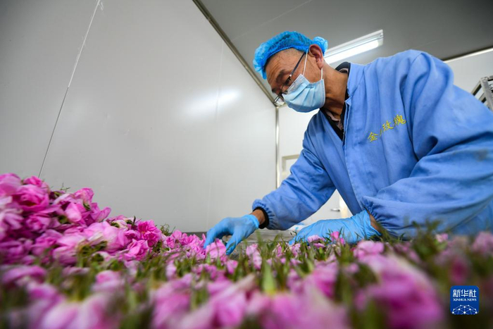 6月15日,在四川省阿坝州小金县“金山玫瑰”基地,工人将玫瑰花干花装袋。新华社记者王曦摄