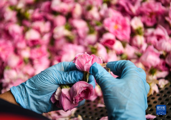 6月15日,在四川省阿坝州小金县“金山玫瑰”基地,工人正在选花。新华社记者王曦摄