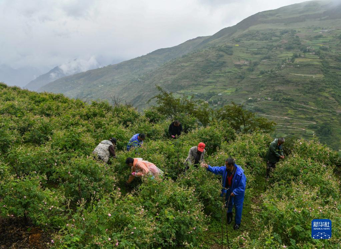 6月14日,在四川省阿坝州小金县新桥乡共和村,当地种植户在采摘玫瑰鲜花。新华社记者王曦摄