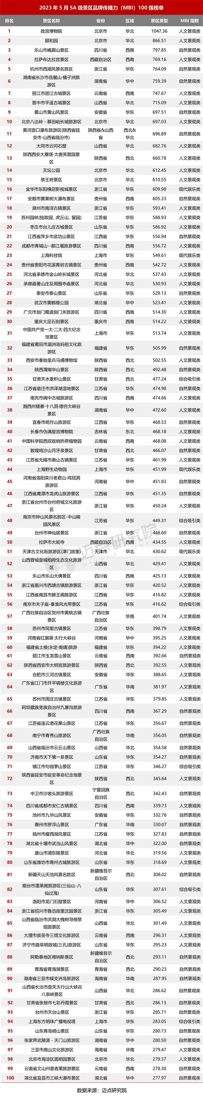“2023年5月5A级景区品牌传播力100强榜单”数据来源于迈点品牌指数MBI,根据5月迈点品牌指数MBI的318家5A级景区数据汇总统计而成。具体说明如下: