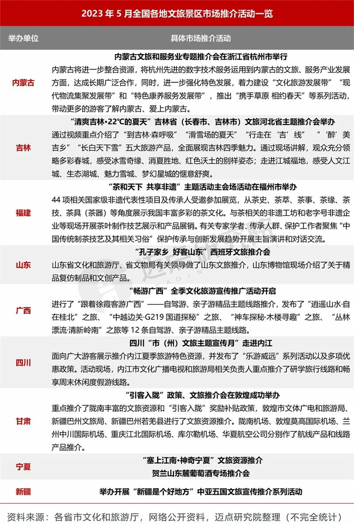 5月,文旅景区市场热度空前高涨,各地文旅部门在市场推广方面加大工作强度。据迈点研究院不完全统计数据显示,本月全国共有9个地区举办各类大型推介活动,如山东的“孔子家乡 好客山东”西班牙文旅推介会,与境外推介,促进文旅市场的外部拓宽,实现境内外文化的友好交流。