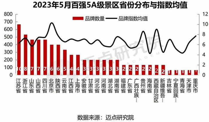 区域所属中,华东仍保持突出地位,占据38个席位。华北、西北、华中在本月5A级区域景区百强榜单中均呈现上涨趋势,随着旅游的回暖,各地景区的发展也呈现散点多态优质的发展趋势。从省份角度来看,榜单前十分别为:江苏省(10)、浙江省(8)、山东省(7)、山西省(7)、四川省(7)、北京市(6)、陕西省(6)、云南省(5)、江西省(4)、上海市(4)。