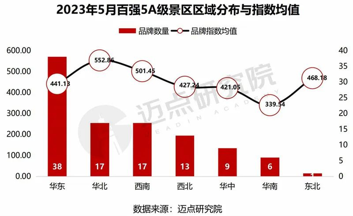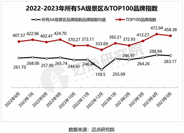 经迈点研究院监测,5月5A级景区品牌指数较之4月数据明显下降,所有5A级景区的平均品牌指数为283.17,环比下降2%;5月100强5A级景区MBI品牌指数均值为458.38,环比下降3.08%。5月整体数值受五一节假日消退影响较大,环比均呈现下降趋势。