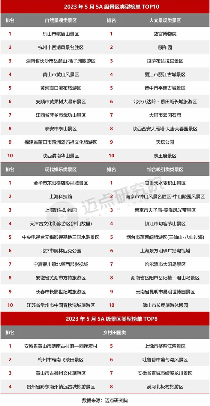 以下是迈点研究院独家发布“2023年5月5A级景区品牌传播力(MBI)100强榜单”。5月,故宫博物院、颐和园、乐山市峨眉山景区、拉萨布达拉宫景区、杭州市西湖风景名胜区、湖南省长沙市岳麓山·橘子洲旅游区、丽江市丽江古城景区、晋中市平遥古城景区、黄山市黄山风景区、北京八达岭-慕田峪长城旅游区跻身榜单前十。
