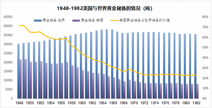 根据世界黄金协会的数据,1948年全世界黄金储备共3.02万吨,其中美国就有2.17万吨,占比超过70%。但随后储备就开始不断流失,尤其是1957年之后,美国的黄金储备急转直下,到1968年,美国的黄金储备近乎腰斩,落到了1万吨以下,占比也从70%到了不到25%。1971年,面对不断流失的黄金储备,尼克松选择躺平,不再承担黄金的兑换义务,布雷顿森林体系也就正式走向了末路。