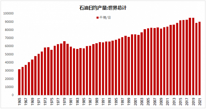 世界石油产量实际变化不大,1971年,实际石油日均产量是5亿桶左右,到今天也不过是9亿桶左右。这么多年还没有翻倍,真的是已经非常克制了。