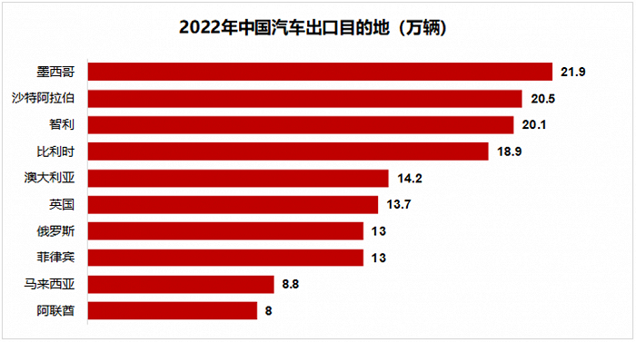中国汽车出口的目的地比较分散,毕竟主要的汽车消费国,都有着不小的众所周知的门槛。2022年中国汽车出口的第一目的地是墨西哥、其次是沙特阿拉伯和智利。去年因为俄乌危机,中国对俄罗斯的出口量大增,但也不过13万辆,仅仅排在第六位。