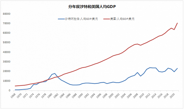 1968年时,沙特人均GDP只有777美元,当年美国是4696美元,美国刚好是沙特的6倍,到了1979年,沙特的人均GDP超过1.2万美元,当年就超过了美国。