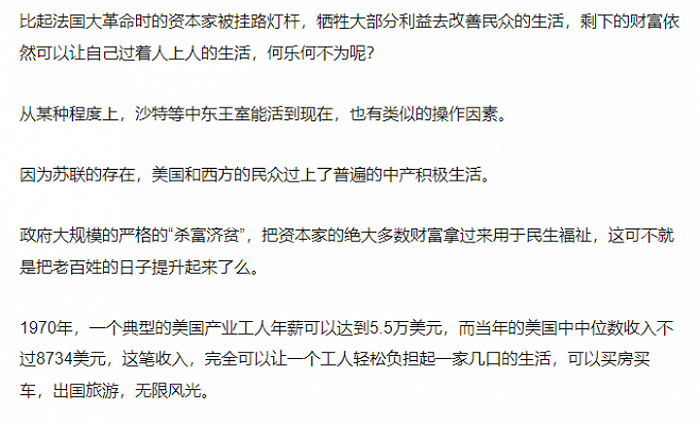 我们都知道,上个世纪50-70年代的二十年,是美国中产阶级的黄金年代。有人将那段时间美国工人的优越生活归功于苏联的制度竞争,比如刘正在《苏联解体,美国工人的幸福随之终结》一文中,就这么写道: