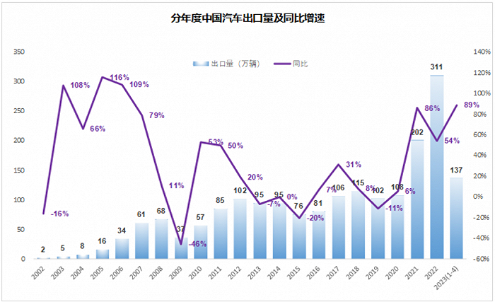 这个时候,全球疫情控制最好,拥有全产业链的中国,就成了全村的希望。2021年中国汽车出口增长86%直接从100万辆跳到了200万辆,2022年再上一个台阶到了300万辆。