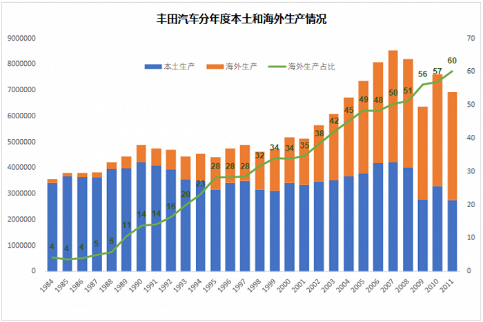 1984年,丰田汽车还只有4%的汽车海外生产,到了2007年,海外生产汽车的总量就已经超过了本土,丰田也真正走出日本,成为全球车企。