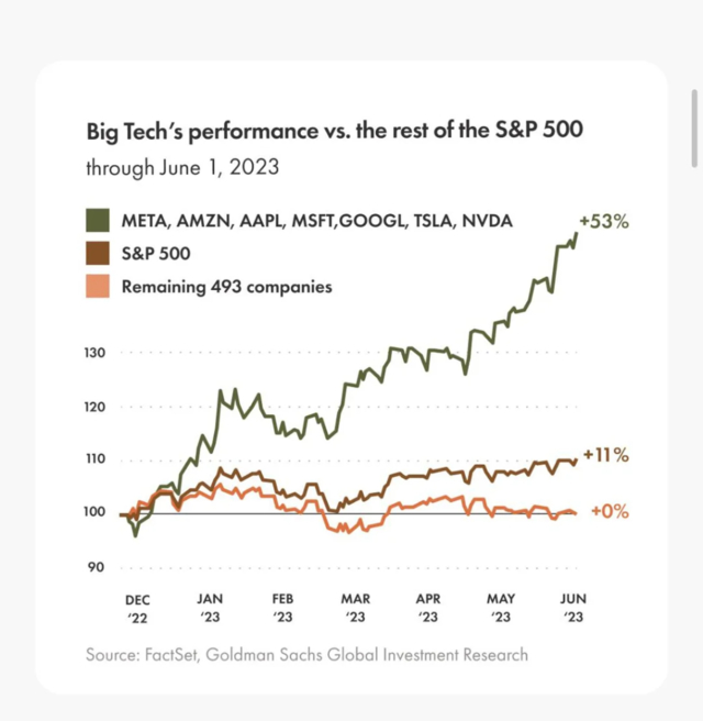 七个最大的成分股——苹果、微软、谷歌母公司alphabet、亚马逊、英伟达、特斯拉和Meta——今年的涨幅在40%-180%之间,而其他的493家公司,总体表现乏善可陈。