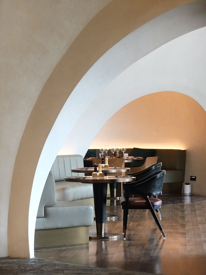 沿着水泥线索前行,餐饮区域是整座酒店工业风最浓郁张扬的所在。全日制餐厅锲舍·餐厅主打招牌烤炉特色烧烤,室内设计灵感源自采矿作业留下的空洞,光影在空中留下一道道美妙的弧线,如同将餐桌搬到了洞穴中。