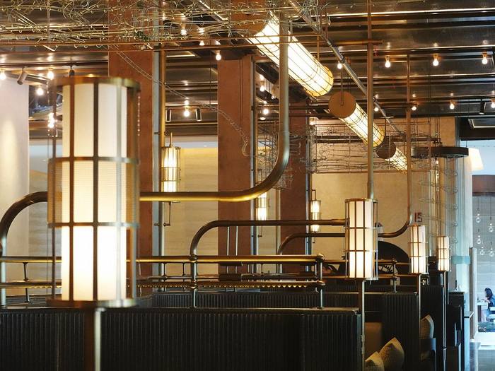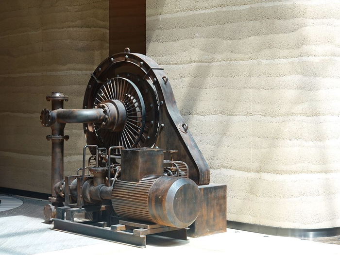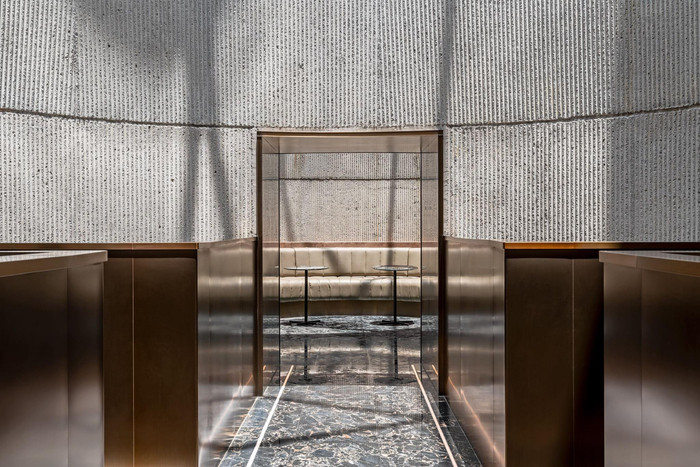 大堂如同一支关于工业情结的序曲,机械工艺随处点题,挑高的空间不时会出现做旧的管道和阀门,高墙上的柱状木质结构同样受筒仓启发,甚至观光电梯的井道也由既有筒仓改造而成。几何结构机械装置、钢铁构件变身摩登摆件,无声地呼应这家傲途格的英文名Cast(铸件)。顶棚的玻璃设计使得阳光无拘无束地挥洒,透出灵动感的玻璃灯饰和质朴的夯土墙面一起,为冷峻硬朗的工业风注入融融暖意。