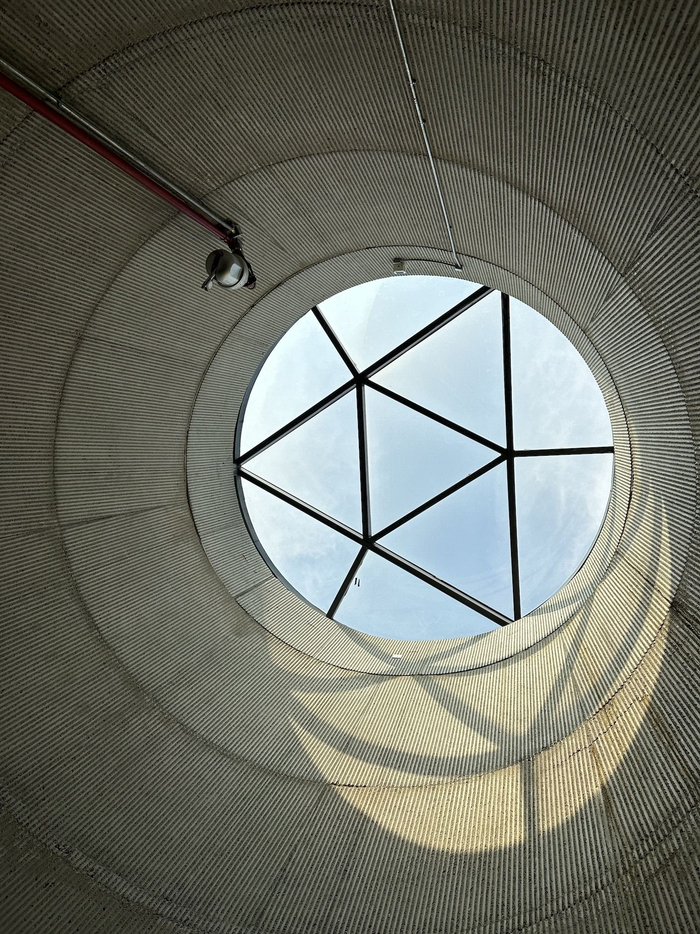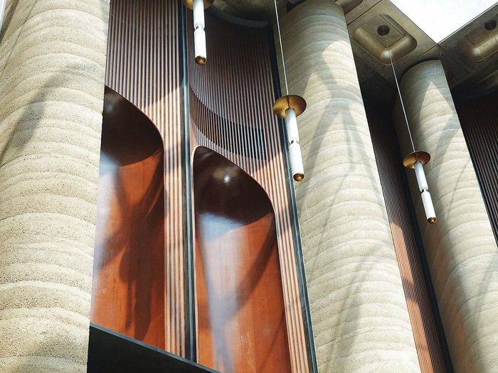 室内设计由泰国的PIA事务所操刀,自然而然地选择了浓厚的“工业风”作为设计基底,水泥与机械元素贯穿始终。酒店内部保留了水泥厂用于储放物料的的四个筒仓,其中一个通过楼梯和连廊串联起多个休闲空间,形成一个富有仪式感的“交叉路口”。工业与艺术风格在筒仓顶部交汇,昔日巨大的圆柱体加上玻璃天顶,让日间的自然光线倾泻而下,人们可以在仓下小憩、交谈,再现了昔日厂房的独特光影。 同时,“筒仓”也是珺懋酒店logo的设计灵感来源。