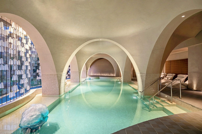 如果入住的只是普通房型,酒店负一层的土耳其浴场风温泉泡池“麓泉”不容错过。洞穴式的穹顶设计让空间富于趣味,移步换景,让汤山温泉水舒缓呵护身心,在氤氲的温热水汽中探秘几何之美。