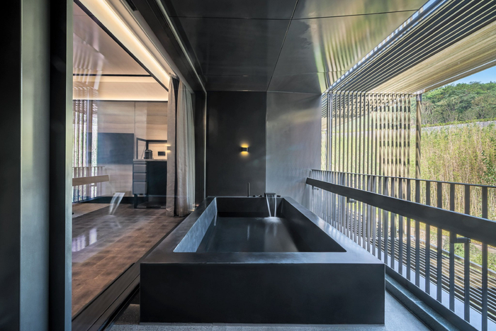 南京珺懋酒店共有110间客房, 以水泥作为主要特色元素,混搭相对柔和的材料,如木材、磨砂玻璃和织物,抹去了一部分工业风的凌厉。浴室的盥洗池使用了齿轮形状的设计,卧室床头的灯具则吊在“滑轮”上,浴缸和沙发墙面还各悬有一块旧水泥厂出品的水泥板,工业质感营造出时光隽永的独特氛围。落地窗直面一片竹海,筑馆私汤大床房还设有引入汤山温泉水的私家泡池。南京汤山古称“温泉”,位居中国四大温泉之首,地下涌泉富含多种矿物质和微量元素,酒店温泉水通过循环水系统送往酒店各个泡池,可直接用于淋浴和浸浴。