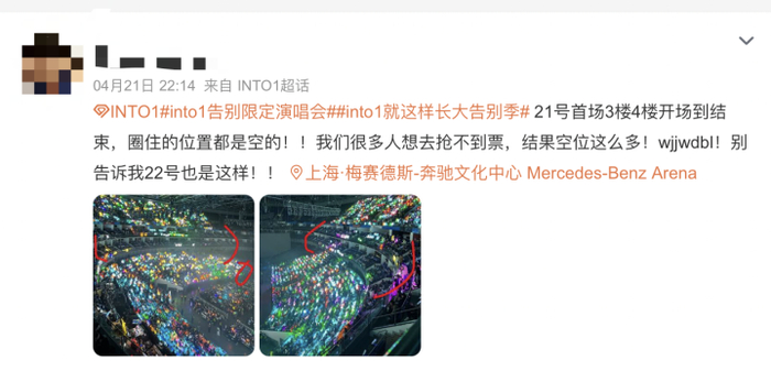 比如人气男子组合into1演唱会曾出现看台前排座位集体空缺,韩国女子组合Blackpink某场演唱会也曾出现某部分位置上座率堪忧的情况。对“黄牛”来说,某些高价的前排票,宁愿砸在手里,烧掉撕掉也不愿低价售出。曾有“黄牛”把流量组合演唱会第一排的票全部背回,表示就算变成纸也不卖:“这是‘黄牛’的从业原则,我就算背回家扔了也不贱卖。”