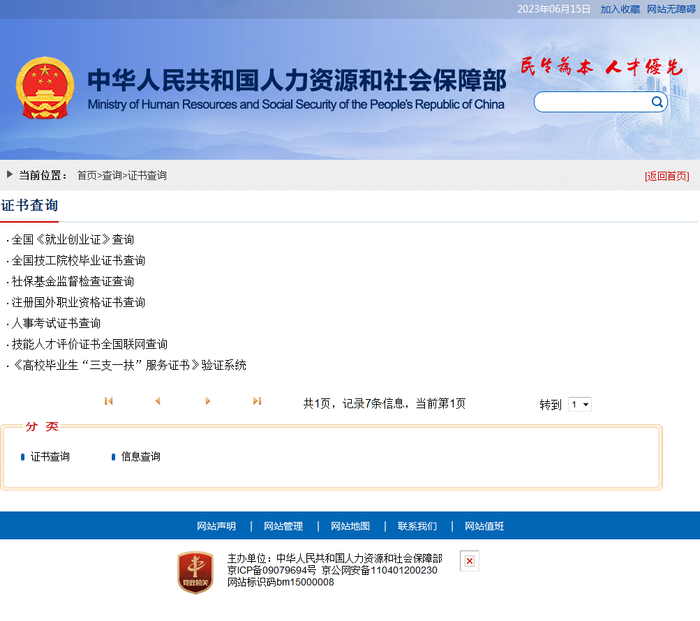 http://www.mohrss.gov.cn/SYrlzyhshbzb/fwyd/zaixianchaxun/zscx/