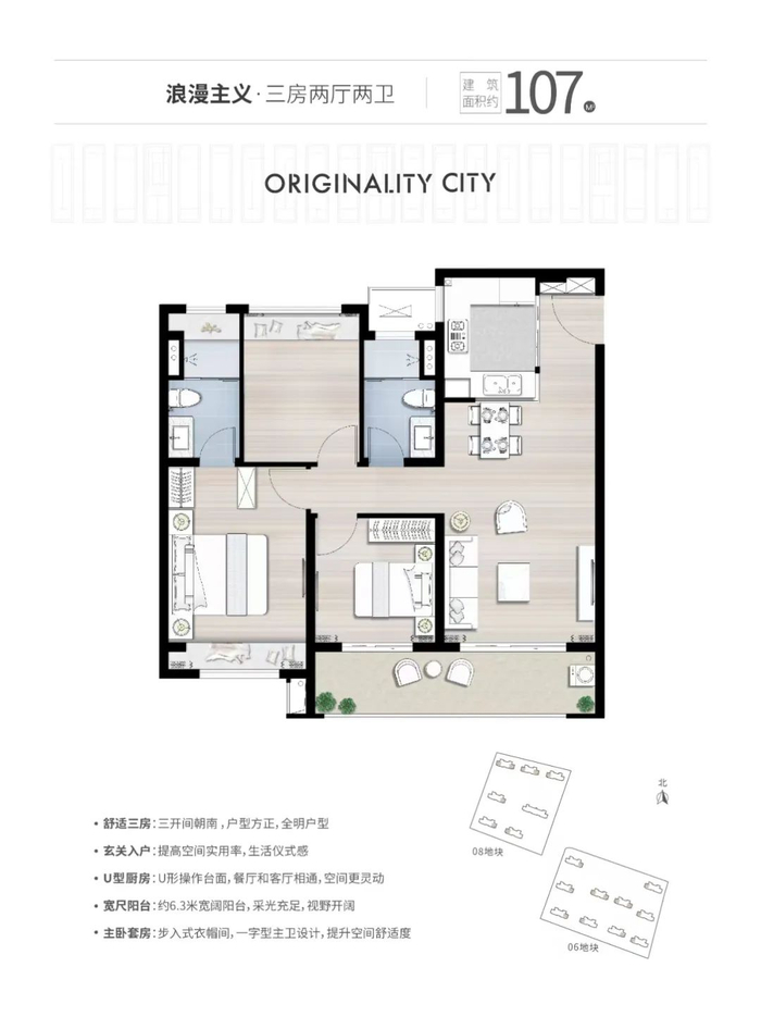 建面约107㎡三室两厅两卫与89㎡的在整体设计上相差不大,同样有双阳台、动静分离等设计,但107㎡户型的主卧采用套房设计,设立了单独的卫生间,空间也更大,隐私感更上一层楼,适合刚改、改善人群。