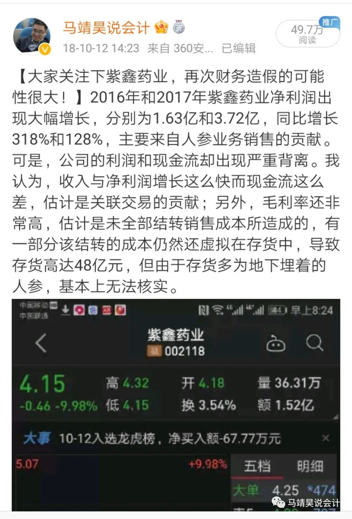 15日,*ST紫鑫开盘一字跌停,报收0.37元/股,这是其连续第30个交易日跌停,*ST紫鑫股票收盘价已连续20个交易日低于1元,触发深交所退市规定,曾经的东北参王终于走到退市这一步。不仅要离开资本市场,紫鑫药业还面临着很严峻的企业经营问题。在6月6日回复深交所问询函的公告中,紫鑫药业披露了截至2023年4月30日,公司欠薪1.02亿元,欠息13.78亿元,欠税9004.09万元,又据2023年一季报,截至今年3月末,公司负债累计高达88亿元,这已经充分说明该公司已经陷入财务困境。与此同时,*ST紫鑫相关负责人还在回复投资者“公司林下参价值60亿元。” 其实,真要有这些存货,怎么会支付不起一亿元的员工薪酬,不符合常理,估计这些所谓的“存货”大部分都是子虚乌有,都是该企业虚增利润造的孽,虚增利润总得虚增资产来平衡吧,这家企业就选择了存货,它这样选择,是欺负审计人员实在是没有点清楚“林下人参”数量的本领。大伙再看下,我在2018年10月12日是怎么判断紫鑫药业财务造假的。