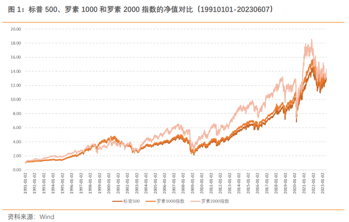 如果看美股历史情况,相较于大盘风格,小盘风格长期业绩表现更优。罗素2000指数是最常用的美股小盘股指数,其成份股包括了美国市场上市值排名在1001-3000的两千家美股公司的股票,常作为小盘投资组合的业绩比较基准。复盘1991年以来,美国大盘股指数代表标普500、罗素1000和中小市值公司代表罗素2000的业绩表现,截至2023年6月7日,年化收益率分别为8.15%、8.33%和8.48%;6月以来,罗素2000指数开始反攻涨幅7.93%,表现明显优于标普500和罗素1000。