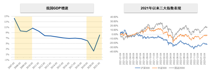 从经济增长来看,我国GDP增速自2020年中开始触底反弹,在2021年2月自2023年4月的27个月中,国证2000指数跑赢沪深300指数的次数为14次,平均月超额1.92%。从指数弹性来看,在A股于2022年4月触底启动反弹后,截至2023年2月28日,沪深300、中证500、国证2000指数较2022年4月26日反弹幅度分别为7.54%、21.47%、34.66%。