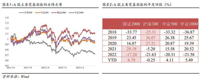 2021年以来,小盘风格开始走强,以国证2000、中证1000等为代表的小盘风格收益表现领先于以沪深300为代表的大盘风格。2023年以来小盘风格持续,截至2023年6月2日,国证2000指数回报为6.79%,高于沪深300指数的-0.25%和中证500指数的4.11%。对比其他小盘风格指数,国证2000年度回报更高,相较于同样表征小盘风格的中证1000指数,2021年至2023年的超额收益分别为8.67%、4.38%和1.30%。