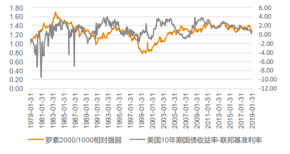 另一方面,罗素2000/1000指数的相对强弱受利率变化影响较大。美国10年期国债收益率与基准利率差值的大幅下行通常意味着市场对于未来经济形势不乐观,小盘指数往往跑输大盘指数。并且这种相关性自2014年以来有所加强。